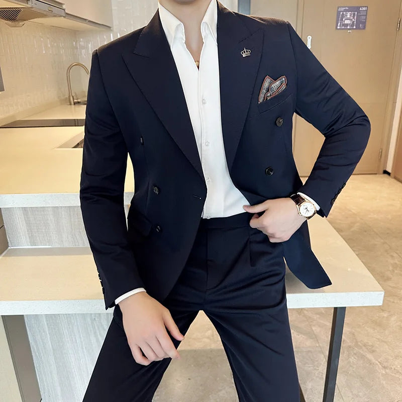 Descubra a essência do estilo italiano com nosso terno masculino de luxo, projetado para transformar sua presença em qualquer evento. Este conjunto de duas peças, composto por um blazer de design duplo breasted e calças elegantes, eleva seu visual a um novo patamar de sofisticação.